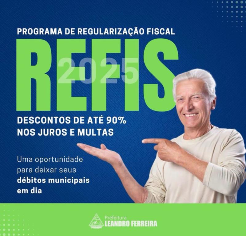 O Prefeito Municipal propôs e a Câmara Municipal aprovou a Lei Complementar Municipal nº 040/2025, que instituiu o Programa REFIS. O REFIS é um programa de recuperação fiscal para que as pessoas físicas e as empresas possam liquidar os débitos relativos aos tributos municipais vencidos até 31/08/2025 (IPTU, ISSQN, etc.), com descontos de até 90% sobre multa e juros. Mas atenção, você tem até 30 de Dezembro de 2025 para aderir ao REFIS e regularizar sua situação com a Prefeitura Municipal aproveitando descontos de juros e multas de até 90% e em até 24 parcelas.